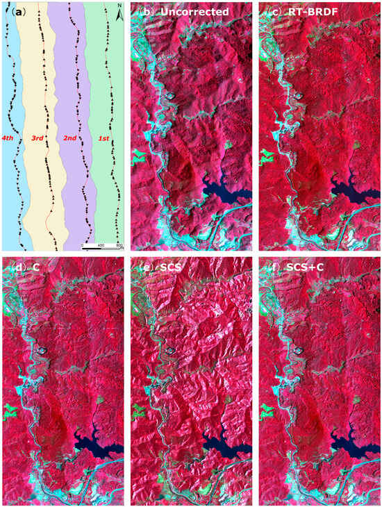 Comparison between the pre-and post-corrected hyperspectral mosaics displayed as false-color composites (i.e., 837.19, 694.91, 543.72 nm band for the R, G, and B channels, respectively): (a) outline of hyperspectral flight-lines and mosaic; (b) pre-corrected (no terrain induced atmospheric effects corrected) mosaic; (c) RT-BRDF corrected mosaic; (d) C corrected mosaic; (e) Sun-canopy-sensor (SCS) corrected mosaic; (f) SCS+C corrected mosaic.