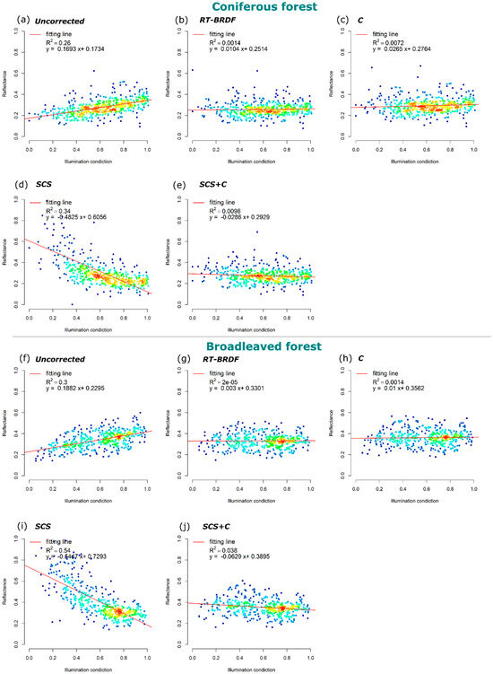 Density scatterplots of the relationship between illumination conditions and reflectance at 837.19 nm for coniferous (a–e) and broadleaved (f–j) forest. (a) Uncorrected, (b) RT-BRDF, (c) C, (d) SCS, and (e) SCS+C corrected reflectance values of coniferous forest pixels; (f) uncorrected, (g) RT-BRDF, (h) C, (i) SCS, and (j) SCS+C corrected reflectance values of broadleaved forest pixels.