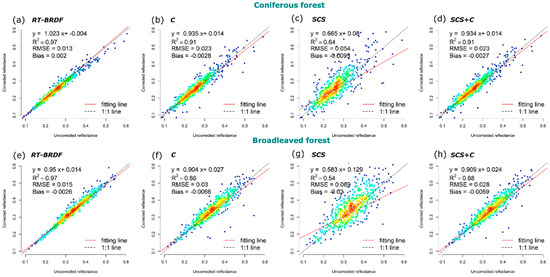 Density scatterplots of the relationship between corrected and uncorrected BOA apparent reflectance at 837.19 nm for aspect perpendicular to the solar direction for coniferous (a–d) and broadleaved (e–h) forest. The best linear fit is in solid red, and the 1:1 line is in dashed blue.
