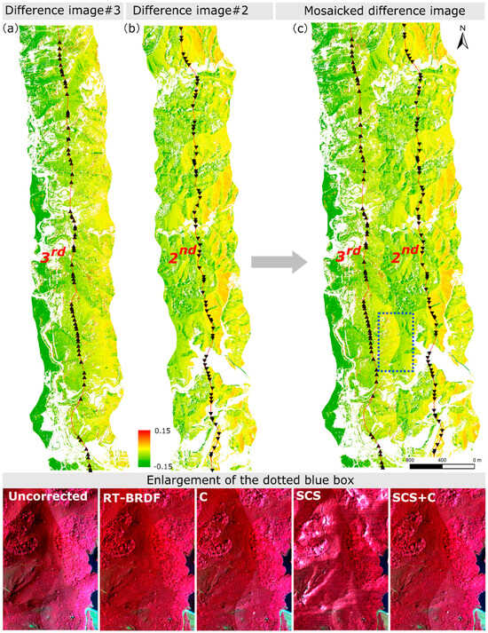 Reflectance difference between RT-BRDF and C correction methods at 837.19 nm for (a) the third and (b) the second flight-lines (red line, with black arrows showing flight direction); (c) difference of mosaicked second and third flight-line and example close up (dotted blue box). Non-forested areas are in white. At the bottom, false-color composite close ups of the region delineated by the dotted blue box are shown.