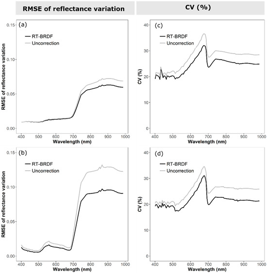 - Finally, this mitigation effect can be further confirmed by the analysis of the RMSE of the reflectance variation in the forested pixels (i.e., coniferous and broadleaved forest) from overlapping pixels of two adjacent hyperspectral images. In fact, a further effect of the BRDF correction is to decrease the standard deviation of the reflectance spectra for each land-cover type [53]. The coefficient of variation (CV) defined in Equation (28) is utilized to evaluate the results obtained with the RT-BRDF method: