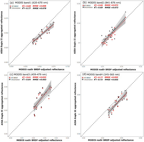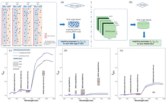 - The weighting parameters of the MODIS BRDF/Albedo Model Parameters product were identified from the relatively pure forest pixels. Then we performed the comparison of the VHR pixel-based three BRDF model weighting parameters (, , and ) of AISA Eagle II bands (400–990 nm) with the coarse scale (500 m) weighting parameters of MODIS band1–4, respectively. Further, 500 × 500 AISA Eagle II pixels (500 × 500 m) were aggregated to match the MODIS pixel and to assess the difference of the nadir BRDF-adjusted forest reflectance between the aggregated AISA Eagle II data and MODIS data. Specifically, the AISA Eagle II band reflectance corresponding to the reflectance of MODIS band’s central wavelength (i.e., AISA Eagle II band54, 644.8 nm for MODIS band1, 620–670 nm; AISA Eagle II band98, 856.6 nm for MODIS band2, 841–876 nm; AISA Eagle II band16, 467.9 nm for MODIS band3, 459–479 nm; AISA Eagle II band35, 555.4 nm for MODIS band4, 545–565 nm).