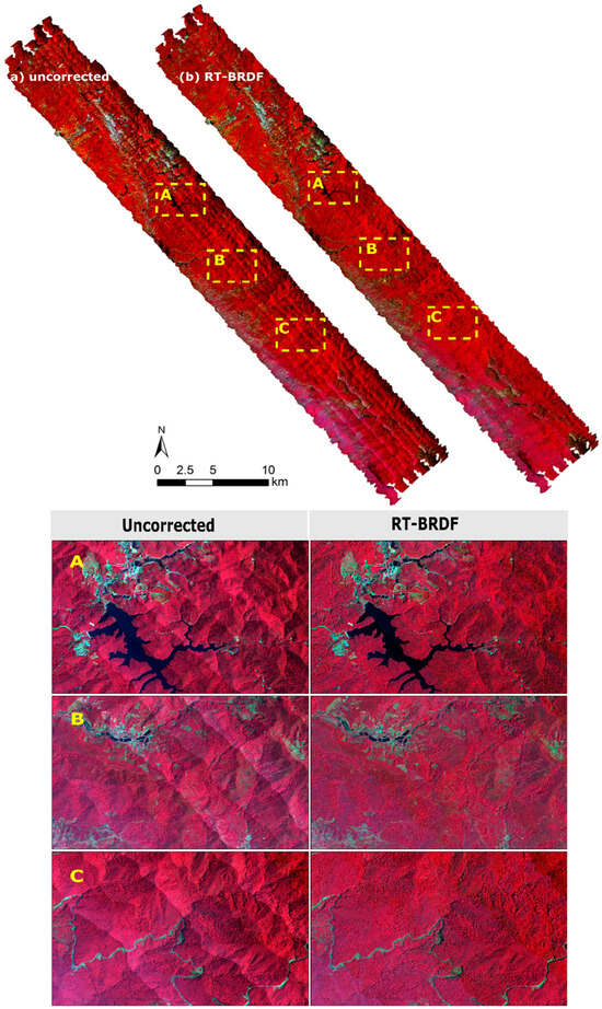 - The terrain-induced canopy BRDF can lead to reflectance variations with slope and aspect (i.e., topographic conditions). Practically, sun-facing pixels would potentially have higher reflectance than pixels lying on shaded slopes. An effective BRDF correction method can weaken the influence of topographic conditions, resulting in a more homogeneous spectral balance between sunlit and shaded areas.