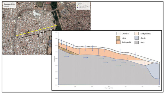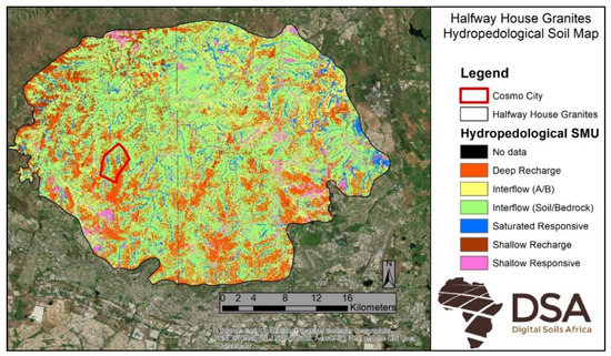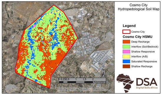 This paper presents how historical remote sensing was used to provide the pre-urban land cover required to use DSM methods to create a soil map for Cosmo City, a suburb in Johannesburg, South Africa. By using Landsat satellite imagery from 2004, before the development commenced, a natural-conditions soil map could be created using DSM methodology. This map was then used as input to model the hydrology of the suburb, which allowed for the identification and prescription of mitigation measures at Kampala Crescent—a road where subsoil water caused serious road damage. Furthermore, the influence of the infrastructure development on the hydrology of the area was quantified by hydrological modelling of the entire suburb. This study differs from previous studies which used remote sensing data for hydrological models [17,18,19], as the Landsat images were used to map the soil, which were the input into the hydrological model, rather than using Landsat images for land cover or surface sealing indications.