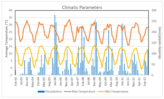 A nine-year simulation period was selected (1 August 2003–31 December 2012). Climatic data for this period was obtained from the Climate Forecast System Reanalysis [36] project done by the National Center for Environmental Prediction (NCEP). WeatherGen in SWAT+ Editor used daily precipitation, temperature (minimum and maximum), wind speed, solar radiation, and relative humidity from sta2607s2781e (lat. −25.76, lon. 27.50) to generate daily climatic variables for the simulations. Figure 7 presents the average monthly minimum and maximum temperatures as well as the total monthly rainfall for the simulation period. Results are reported from January 2004, which allowed the model 5 months to settle.