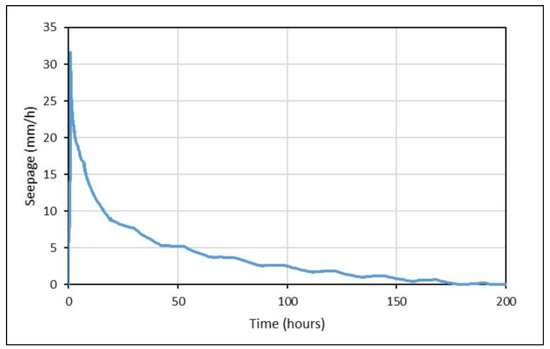 The 2-D simulations of Kampala crescent demonstrate that seepage will occur immediately after the rain event from the 9.3 m seepage face (Figure 10). The maximum seepage rate is approximately 32 mm·h−1 and occurs after 6 h of rain. The seepage rate will decline as a 6 mm·day−1 potential evaporation until seepage will cease after approximately 8 days. With a peak discharge rate of 32 mm·h−1 the total volume of seepage water from in the area is approximately 0.3 m3·h−1·m−1 of roadway (with the 9.3 m seepage face). If, for example, 100 m of Kampala Crescent is impacted by the seepage, subsurface drains should have a carrying capacity of 30 m3·h−1 (0.085 L·s−1·m−1).