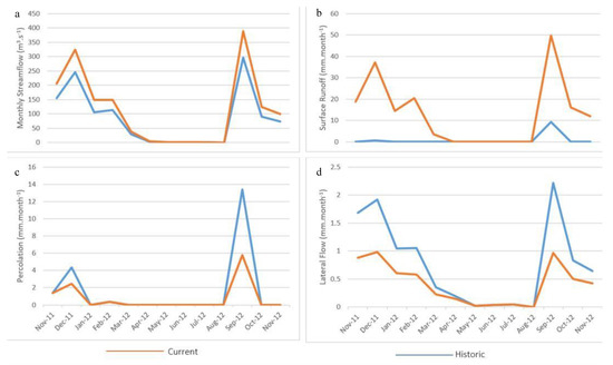 Average monthly modelling results for the Cosmo City suburb. (a) Streamflow, (b) Surface runoff, (c) Deep percolation, and (d) Lateral flow, for the time period November 2011 to November 2012.