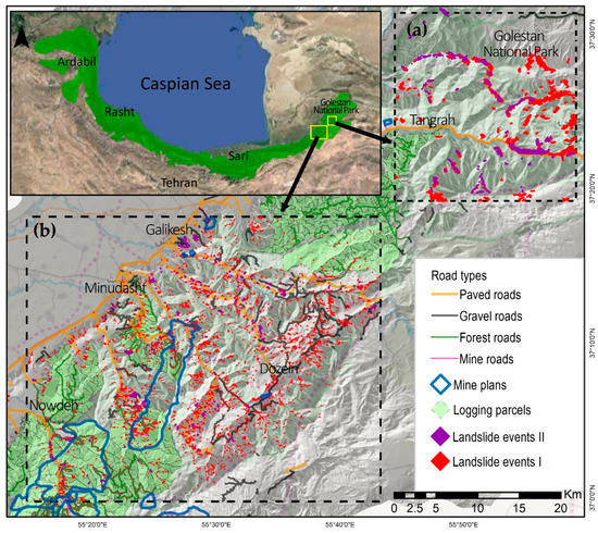 Location of the study areas in the Hyrcanian ecoregion in NE Iran: the Golestan National Park as a “protected forest” (a); and disturbed forests by mining, logging, and road building as a “non-protected forest” (b). Landslide events I were collected from different resources in the current research and the landslide events II were adopted from Shirvani et al. [72].