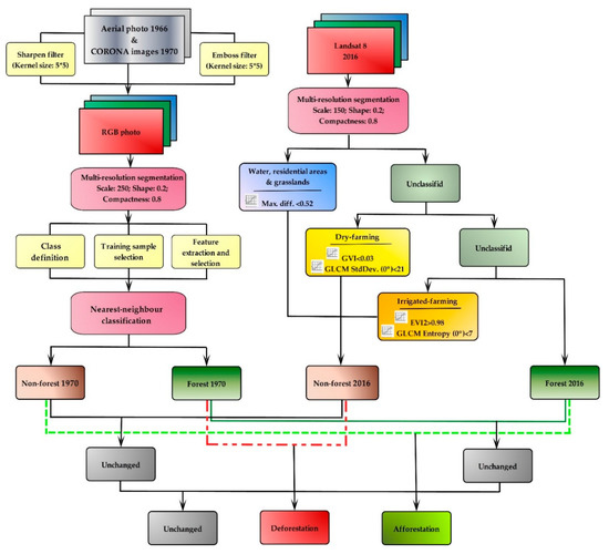 The process of discriminating forests from non-forests using object-based nearest neighbor and rule-based classifications by utilizing CORONA images/aerial photos of 1970 and Landsat 8 of 2016 over the protected and non-protected forests in NE, Iran (after Shirvani et al. [82]). Abbreviations: stdDev.: Standard deviation; Max. diff.: Maximum difference; GVI: Green Vegetation Index; EVI2: Enhanced vegetation index2; GLCM: Gray-level co-occurrence matrix.
