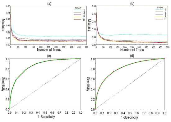 The optimal number of trees and the number of variables for splitting in each tree of the random forest based on the minimum misclassification error for mapping landslide susceptibility in the protected forest (a) and non-protected forest (b); the area under the ROC curve obtained from the out-of-bag error for testing the performance of random forest for mapping landslide susceptibility in the protected forest (c) and non-protected forest (d) in NE Iran.