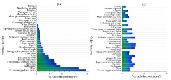 The importance values of natural triggering factors were relatively equal between the two forests. The top variables of this category were earthquake (9.3%) and rainfall (4.6%) in the protected forest (Figure 4a), while all three variables roughly gained equal values in the non-protected forest (Figure 4b). Although the importance of natural triggering factors such as earthquake [52] and rainfall [49,52,53,78] has been reported for mapping landslide susceptibility, earthquakes trigger landslides by generating primary slips and intensifying liquefaction in the saturated soils [52]. The intensification of natural hazards due to human intervention can increase the landslide susceptibility, as the importance of flood in the mapping of landslide susceptibility increased from 2.3% in the protected forest to 5.6% in the non-protected forest.
