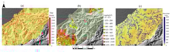The top influential anthropogenic triggering factors for mapping landslide susceptibility in the non-protected forest, NE Iran: the edge density and mean shape index indicating the forest fragmentation induced by road-network expansion and forest conversion (a,c); and the aggregation of logging volumes (b) from 1970 to 2016.