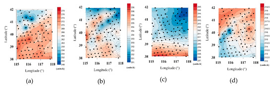 Contour map of the one-dimensional variational retrieval results from 11 December 2018: (a–d) retrieved temperature profiles and (e–h) retrieved humidity profiles. Each black dot represents 92 samples.