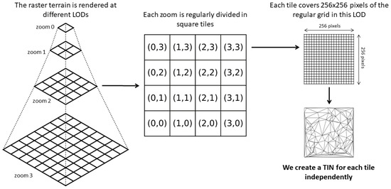 In this sense, the problem of displaying large images on the web has been being tackled for several years. In order to render large geo-referenced images, several tiled image decomposition standards have been presented, some of them with a remarkable level of acceptance [1,2]. These services provide access to fragments of maps pre-rendered in a set of fixed scales. Thus, the structure is basically a hierarchical multi-resolution data structure, following a quadtree-like decomposition, resulting in a pyramid of LODs where each LOD—also referred to as a zoom level—is further divided into square tiles of a fixed size (see Figure 1 for a graphical representation of this concept). In a way, geo-referenced regular terrain height fields can be considered as images (rasters), and consequently we can use the same approach to transfer them on the web. This service, coupled with a desired pixel error tolerance and a geo-referenced user point of view, allows accessing the tiles in the LOD that best fit the current view [5].