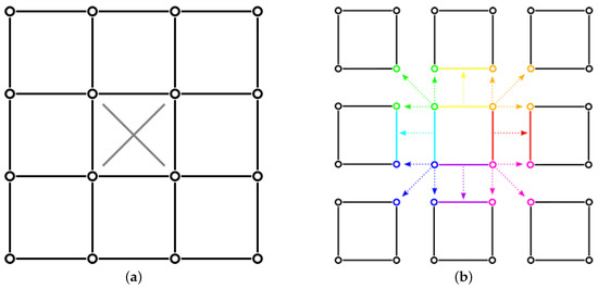Summary of the relations to preserve for neighboring tiles. In (a), we depict a regular grid representing the eight neighboring tiles of the center tile, marked with a grey cross, which we are processing. We mark the corners of the tile with a circle and the rest of coincident vertices at the borders with a straight line. In (b) we space out the tiles, to emphasize that each one has to be processed separately. Note that, when the central tile finishes processing, the corners are transferred to the adjacent three tiles, while the borders are transferred to just one neighboring tile.
