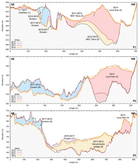 - Behncke, B.; Fornaciai, A.; Neri, M.; Favalli, M.; Ganci, G.; Mazzarini, F. Lidar surveys reveal eruptive volumes and rates at Etna, 2007–2010. Geophys. Res. Lett. 2016, 43, 4270–4278. [Google Scholar] [CrossRef]