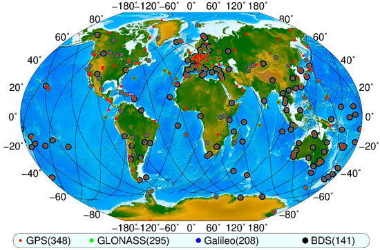The Multi-GNSS Experiment (MGEX) was initialized in 2013, aiming to track, collate and analyse all available GNSS signals [27,28]. By January 2020, the MGEX network had grown to more than 300 stations and a continued expansion is expected in the future. Especially in the past two years, with the rapid deployment of BDS and Galileo, the MGEX stations have significantly increased. To achieve a meaningful conclusion, we collected data from 348 IGS and MGEX stations in 2017 and 2018, as illustrated in Figure 1. All the stations were able to track GPS signals, whilst 295, 208 and 141 stations could normally receive GLONSS, Galileo and BDS signals, respectively. Although we used 348 stations in total to model the global ionosphere, the number of stations we applied for each day was around 300, which was close to the number of stations used by the IAACs.