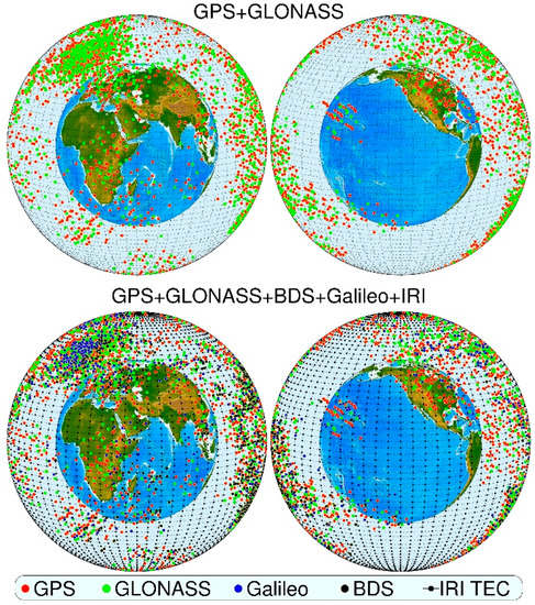To have a clear sense of the increase of IPP brought by multi-constellation GNSS, as an example, Figure 2 plots the IPP at an epoch on the day of year (DOY) 001 in 2018. The IPP are noticeably increased since the BDS and Galileo satellites are introduced. Actually, the increase in observations is far more than the increase of IPP, because BDS and Galileo can transmit triple or more frequency signals. Each IPP of BDS or Galileo satellite in Figure 2 denotes at least two available ionospheric observations. Therefore, the observations for ionosphere modelling are obviously increased through introducing multi-frequency signals and multi-constellation Galileo and BDS satellites. Unfortunately, the IPP are not evenly distributed in space. The IPP are dense over the regions where there are many GNSS stations, and are scattered for the regions with limited GNSS stations. The VTEC values derived by IRI-2016 can somewhat make up for this deficiency and provide some effective pseudo-observations especially for the regions with less or no available GNSS observations.
