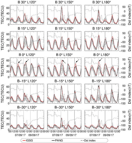The geomagnetic storm on 8 September 2017 was the 18th strongest geomagnetic storms since January 1994 (https://www.spaceweatherlive.com/en/auroral-activity/top-50-geomagnetic-storms). The Dst index started to decrease from −1 nt at UT 22:00 on 7 September to −124 nT at UT 2:00 on 8 September. We selected the region of latitude from −30° to 30° and longitude from 120° to 180°. This region was chosen because its ionosphere was in a high level of ionisation during the onset time of the storm, and 15 points with a distance interval of 15° in latitude and 30° in longitude were selected. The VTEC variation of the 15 points from 6 September 2017 to 10 September 2017 are illustrated in Figure 9. The predicted VTEC values are calculated by the median values from the previous 15 days, and the gray shadow denotes the predicted VTEC ± 2*sigma. We are able to clearly notice the variations of VTEC in the normal days (6 September~7 September and 9 September ~10 September) had a similar trend, and the predicted VTEC values had a better consistency with the estimated VTEC. Caused by the geomagnetic storm on 8 September, the estimated VTEC values showed a sudden increase compared with the predicted VTEC, especially for the points at B30°L150°, B-15°L150° and B-15°L180°. The ionosphere in low latitude is more active than that in medium and high latitudes, the maximum VTEC for the points at latitude 0° and 15° in a normal day usually exceeded 40 TECU. When the geomagnetic storm happened, the highest VTEC for the points at longitude 150° could even reach up to 60 TECU. The VTEC differences between IGSG and PANG were close to zero or usually no more than 2 TECU for the normal days. During storm-time, IGSG and PANG still achieved a better consistency for the points at latitudes ± 15° and ± 30°, and the VTEC differences were within 5 TECU. However, for the three points at the equator (i.e., B0°L120°, B0°L150° and B0°L180°), the VTEC differences were relatively larger, marked as black arrows in Figure 9, and the maximum VTEC differences even reached up to 10 TECU. This suggests PANG normally agrees well with IGSG, however, the VTEC discrepancies between them at the equator even exceed 10 TECU during a geomagnetic storm.