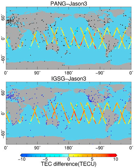 The VTEC values derived from satellite altimetry were used to prove which solution was more reliable during the geomagnetic storm. The ionosphere was relatively active in low latitude, and the VTEC discrepancies between PANG and IGSG near the equator (from latitude −30° to 30°) showed larger values than those in other regions. Therefore, we mainly analysed the VTEC around the equator from PANG, IGSG and Jason-3 on 08 September, where the VTEC differences of PANG minus Jason3 and IGSG minus Jason3 are illustrated in Figure 10. The number of GNSS stations used by PANG and IGSG to model the global ionosphere were 339 and 333, respectively. The distribution of the stations selected by PANG and IGSG were similar and without significant differences. The GNSS stations are sparsely distributed across the ocean area. This means that the available GNSS observations for modelling the ionosphere over the oceans are limited, as a consequence, the accuracy of the estimated VTEC above the ocean is relatively lower compared with that on the land area. In addition, the IGSG modelled the global ionosphere without an a priori model, just using GNSS observations. Therefore, it showed large VTEC differences for IGSG-Jason3 over the ocean area. While PANG introduced not only an a priori IRI-2016 model but also more available BDS and Galileo satellites, as a result, the VTEC differences of PANG-Jason3 were smaller than those of IGSG-Jason3. For PANG-Jason3, 83.42% of the TEC differences were within ± 5 TECU, while the percent for IGSG-Jason3 was just 52.38%, and 10% of the VTEC differences for IGSG-Jason3 exceeded 10 TECU.