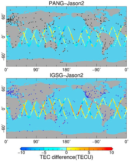 The VTEC comparisons of PANG-Jason2 and IGSG-Jason2 on 8 September 2017 are plotted in Figure 11. In the comparison with Jason2, because there are no GNSS observations in the Eastern Pacific Ocean, both of IGSG and PANG showed larger VTEC differences compared with Jason2. In the Western Pacific Ocean, Indian Ocean and Atlantic Ocean, PANG and IGSG have scattered GNSS stations, but PANG introduces BDS and Galileo signals in the global ionosphere estimation, which adds more IPP and somewhat improves the precision of the estimated ionosphere. Additionally, with the help of IRI-2016, the percent of VTEC differences within ± 5 TECU for PANG-Jason2 achieved 85.65% during the geomagnetic storm. The percent for IGSG-Jason2 was just 68.94%. Therefore, we can see that the PANG had a better performance during the geomagnetic storm.