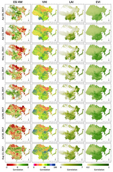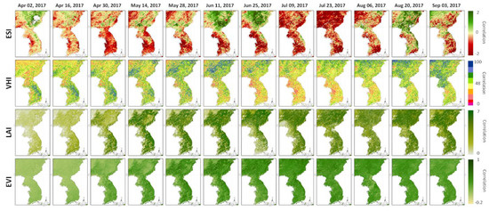 Figure 3 shows a map of China’s spatial distribution obtained with each index. The ESI had a severe drought trend in the Northern and Northeastern regions since late April. In June and July, there was a severe drought trend in the northeastern region, and in August, there was an easing trend. In the case of the VHI, drought trends were observed in the Northern and Northeastern regions in April and May. The Northern part of the country showed severe drought trends until June and July, while the Northeastern part of the country showed a tendency of easing drought after July. The LAI and EVI all showed dry tendencies except for the southern regions until May, with vegetation growing rapidly in the Northeast since July.