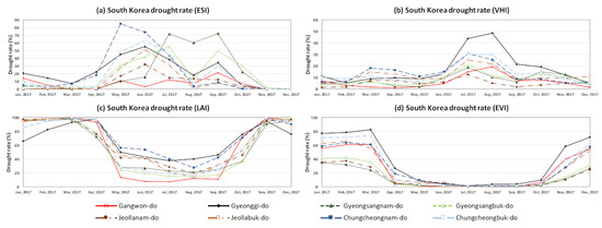 Figure 4 and Table 2 show the drought rate in South Korea. In the case of ESI, the ratio of drought increased sharply in Gyeonggi-do and Chungcheong-do in April. Unlike other regions, Gyeongsang-do had a high drought rate even after July. In the case of the VHI, the overall rate of drought started increasing in June, but has exhibited a reducing trend since August. Among them, there were high drought rates, especially in Gyeonggi-do and Chungcheong-do. The LAI and EVI had very high drought rates before April. From April to September, the drought rate drops sharply. After September, the drought rate increases again. Unlike the EVI, which shows no particular trend, the LAI had higher drought rates than other regions from April to September in Chungcheongnam-do, Jeolla-do, and Gyeonggi-do. The trend of the corresponding results was significantly similar to that of the preceding study [51], which conducted drought assessment using the SPI drought index. The results of the preceding study were significantly similar to the drought trends seen by ESI and VHI. In particular, drought onset periods and drought change flows were very similar to ESI.