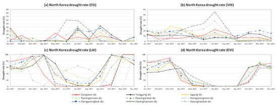 Temporal changes in drought area ratios of total area in each district as determined by the (a) ESI, (b) VHI, (c) LAI, and (d) EVI values for the nine provinces in North Korea during the 2017 drought event.
