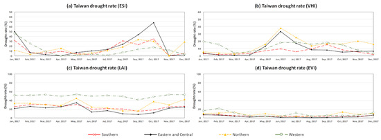 Temporal changes in drought area ratios of total area in each district as determined by the (a) ESI, (b) VHI, (c) LAI, and (d) EVI values for the four regions in Taiwan during the 2017 drought event.