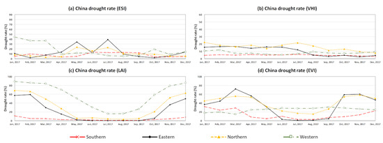 Temporal changes in drought area ratios of total area in each district as determined by the (a) ESI, (b) VHI, (c) LAI, and (d) EVI values for the four regions in China during the 2017 drought event.