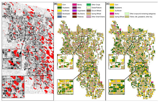 In the U.S., the cropland data layer (CDL) product generated by the U.S. Department of Agriculture (USDA) National Agricultural Statistics Service (NASS) provides a valuable database of crop classification and distribution for the conterminous U.S. [11]. This dataset is heavily used in a multitude of disciplines, applications, and models [12,13,14,15]. The CDL is generated annually by integrating multiple imagery sources such as Landsat products, Moderate Resolution Imaging Spectroradiometer (MODIS), and Resourcesat-1 Advanced Wide Field Sensor (AWiFS) with the objective of maximizing the temporal resolution to capture key phenological stages [16,17]. In addition, imagery is combined with auxiliary datasets such as digital elevation models (DEMs), the U.S. Geological Survey-National Land Cover Dataset (NLCD), and the USDA-Farm Service Agency (FSA)-Common Land Unit (CLU).
