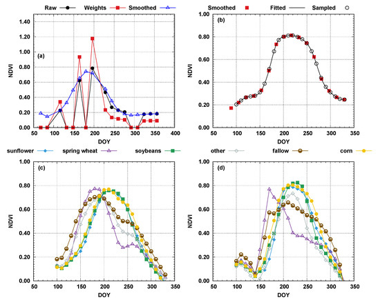 Although the smoothed curves are a better representation of field conditions in time, the curve’s dimensionality varied per year and even per fields within the same year. Fields were described by different DOYs and varying number of samples. This was due to differences in the DOY when images were acquired (see Table 1) and potential gaps were present in one field, but not in another. This was addressed through the function fitting approach to existing points using a piecewise cubic polynomial method [39] implemented in the Scientific Computing library of the Python programming language [40,41]. The advantage of this method is the generation of a smooth curve that goes through the observed points. Once the coefficients are determined, the fitted equation can then be used to estimate values at set time intervals. Values were estimated for every 10 days from DOY 100 to DOY 330 (Figure 4b), assuring all curves (all fields and years) contained the same number of points; a requirement for machine learning algorithms. Using the CDL information assigned to each field, averaged curves for prevailing crop types were developed for 2000 (Figure 4c) and 2005 (Figure 4d).