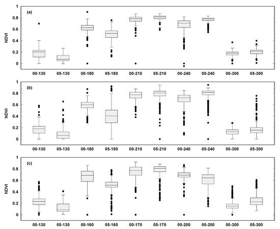 Boxplot of five selected time periods in the phenological cycle for corn/maize (a), soybeans (b), and spring wheat (c). In the x-axis, the first number represents the year (00 = 2000 and 05 = 2005) and second number day of the year.