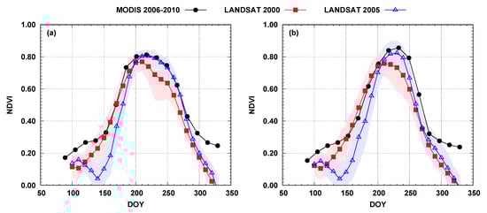 Comparison of the NDVI time series generated from five-year averaged state-wide Moderate Resolution Imaging Spectroradiometer (MODIS) [47] and from yearly processed LANDSAT for the Lower Bear Creek watershed for corn/maize (a) and soybeans (b). Filled curves represent one standard deviation.