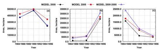 The three models developed, 2000, 2005, and combined 2000–2005 were applied to process the NDVI time series for 1985, 1990, and 1995; years for which CDL datasets are not available (Figure 6). The lack of reference, prevented absolute accuracy assessment and therefore a relative accuracy assessment was performed by comparing the predictions between models. Evaluating the agreement amongst all three models for the predicted correctly planted area for all classes was 68.7%, 75.9%, and 65.46% for 1985, 1990, and 1995, respectively. Slightly higher agreement amongst the three models was observed for 1990. Considering the agreement between the pairs of models, higher agreement was obtained between models 2000–2005 and 2005 for 1985 (88.7%) and 1990 (90.9%) and between models 2000–2005 and 2000 for 1995 (78.7%).