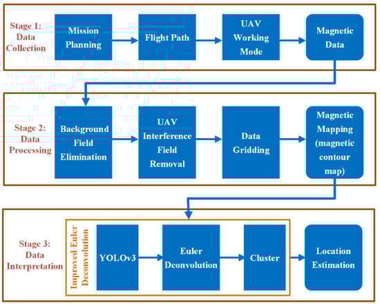 The system design section describes the main components of the UAV-magnetometer system. The processing pipeline consists of three phases, the first phase ensures that the magnetic field data over the test area is acquired successfully by the UAV-magnetometer system, the second phase is to improve the quality of UAV magnetic data through a series of data processing techniques, the third phase realizes the interpretation of the UAV magnetic data and provides the position of the anomalies automatically.