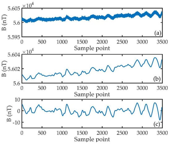 The Earth’s magnetic field is a natural magnetic field, its source is classified as two categories: internal and external [32]. The magnetic field originated from the internal sources is the main component, which generally behaves as a stable dipolar field. The magnetic field originated from the external sources contains geomagnetic pulsations, magnetic bays, magnetic storms, and so on, which are generated by the complex motion of charged particles from the solar wind interacting with the Earth’s ionosphere, behaving as the time-varying geomagnetic signal. The Earth’s magnetic field in the local region is approximated as a uniform and stable background field for a short time. Apart from the geomagnetic field, the observed field is affected by various high-frequency interference fields from the surrounding environment, like the 50 Hz alternating magnetic field produced by the power grid. The background field should be removed because they do not indicate any useful information about the underground targets.