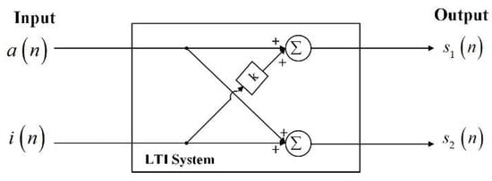 The interference field generated by the UAV platform is in the same frequency band as the anomaly field we are interested in, so it cannot be suppressed by the filter. A two-channel linear time-invariant (LTI) model is established based on the configuration of UAV-magnetometer system, as illustrated in Figure 4 [30].