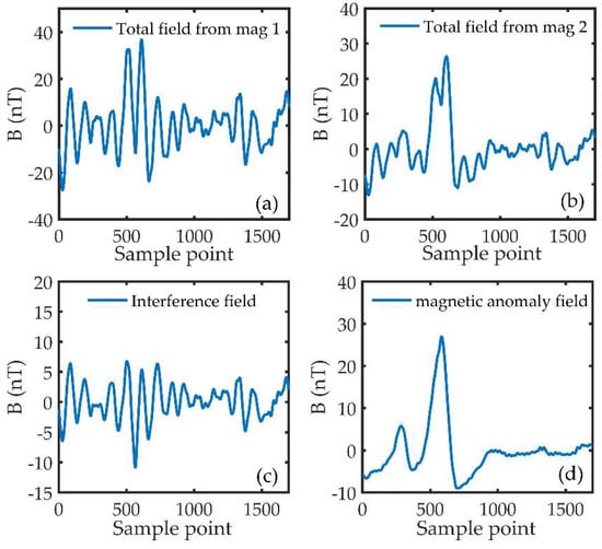 The results after removing the UAV interference field are illustrated in Figure 5, Figure 5a,b depict two raw magnetic field signals sampled synchronously by two magnetometers (The background magnetic field is removed first), Figure 5c,d depicts the extracted interference field and magnetic anomaly field. The magnetic anomaly field and UAV interference field is superimposed and the UAV interference field from the magnetometer 1 even masks the anomaly signal completely. After the compensation, the magnetic anomaly signal and the interference field are separated from the total field, the extracted anomaly field indicates two potential targets, which is in agreement with the actual scene.