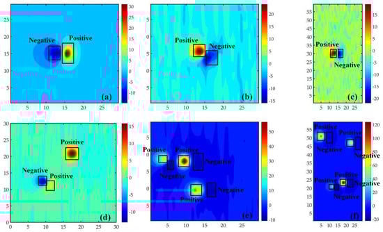 Partial samples and labelled anomalies in the dataset of You Only Look Once version 3 (YOLOv3). Each image is a 2D magnetic contour map, the unit of magnetic field in all figures is nano Tesla (nT), the targets to be detected are divided into two types: Positive and Negative. (a), (b), and (c) show three magnetic contour maps generated by the same target with different azimuths and declinations, remanence, and locations. (d), (e) and (f) show three magnetic contour maps generated by different numbers and sizes of targets, background magnetic fields.
