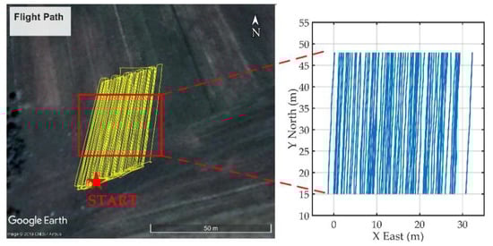 The planning of test site and flight path, multiple parallel profiles along the south-north direction cover the test area. The “START” is the starting point of the drone in the experiment and the trimmed profiles in the local coordinate are given on the right.