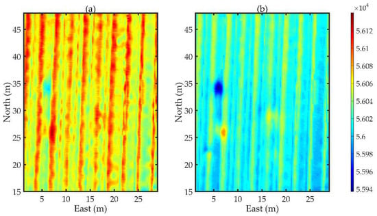 UAV interference magnetic field is suppressed through the proposed algorithm in Section 3.2, the compensated magnetic anomaly field is given in Figure 11. The root mean square (RMS) error is 4.9543 nT and 1.7714 nT for the total signal of magnetometer 1 and 2, respectively, the RMS of separated magnetic anomaly signal is reduced to 0.5391 nT by the proposed method, indicating that the UAV interference field has been suppressed significantly. Compared with the magnetic map of original data, the quality of magnetic map of processed signal has been improved a lot, which is able to reflect the distribution of underground anomalies clearly.