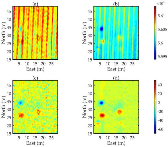 The magnetic map with the background magnetic field removed. (a) The filtered magnetic data from magnetometer 1; (b) The filtered magnetic data from magnetometer 2. (c) The detrended magnetic data from magnetometer 1; (d) The detrended magnetic data from magnetometer 2.