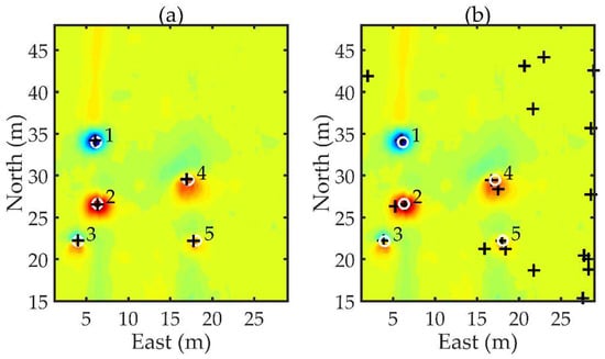The estimated positions of two methods, white round marker ‘○’ is the real location of buried targets measured by the Real-Time Kinematic (RTK) in advance, black cross ‘+’ marker is the estimated location. (a) The YOLOv3-based Euler Deconvolution; (b) The SW Euler Deconvolution.