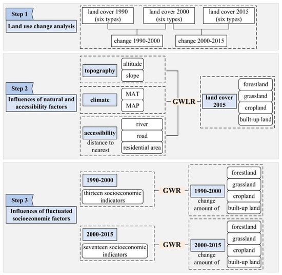 In this study, GW logistic regression was undertaken to analyze the influences of natural and distance factors on land-use spatial distribution at the grid-scale based on 2015 land-cover data. The dependent variables were binary; grids were assigned a value of 1 if they were occupied by forestland and value of 0 otherwise (the same was done for grassland, cropland and built-up land). Next, conventional GWR was conducted at the county scale for two periods (1990–2000 and 2000–2015), to explore the temporal and spatial effects of socioeconomic factors on land-use change. The dependent variable was the amount of change for one specific land-use type during the study period. This model was evaluated at the county scale, the most realistic level in light of data availability and administrative management activities.