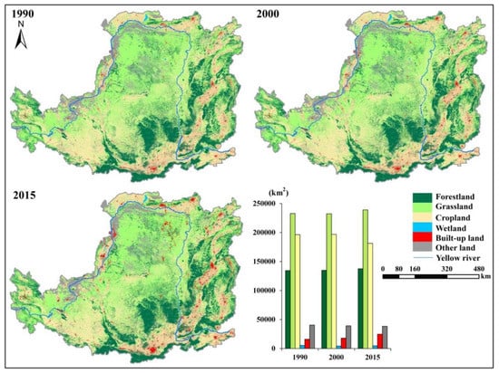 Land-cover maps of the Loess Plateau in 1990, 2000 and 2015 were derived from 30 m Landsat remote-sensing images. An object-oriented classification based on decision trees, combined with manual checks, was used for land-cover mapping. Field-measured land-cover types with GPS coordinates were collected to validate the land-cover maps, and the classification accuracy was about 94% [,,]. The land covers were classified into six broad types: forestland, grassland, cropland, wetland, built-up land and other land (bare rock and desert) [,].
