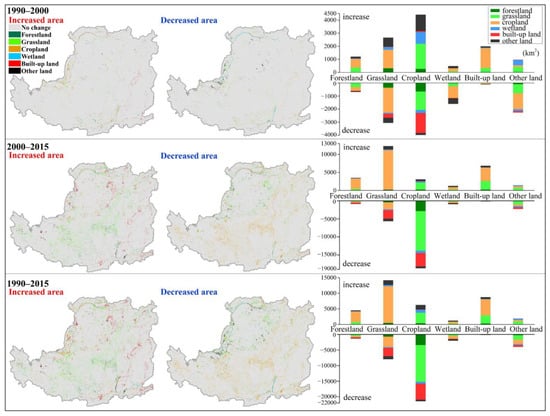 Land-use changes not only show strong coupling and symmetry in change direction but also vary substantially over space (left panel in Figure 4). During 1990–2000, the increases in cropland occurred in the western region, the southern region and the borders of the northern region, co-located with decreasing grassland, bare land and wetland. Hotspots of built-up land gain included the east and north of the study area. During 2000–2015, the increases of forestland and grassland were notable in southwestern and central regions, concurrently with shrinking cropland. Built-up land also exhibited significant increases in this period though it accounts for a small fraction of the study area (less than 4%). Different land-use conversions were responsible for the expansion of built-up land across different areas. In the northern region, the increased built-up land was converted from grassland, whereas in the east and south, it came from cropland transformation. In summary, the region experienced pronounced land-use conversions from 1990 to 2015, characterized by forestland and grassland gain (ecological land restoration) in the central region, co-located with cropland loss and built-up land expansion in the eastern and northern areas.