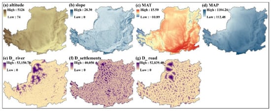 Spatial variations of topography (a,b), climate (c,d) and accessibility factors (e–g). MAT = mean annual temperature; MAP = mean annual precipitation; D_river = distance to the nearest river; D_settlements = distance to the nearest residential areas; D_road = distance to the nearest road.