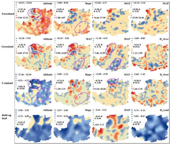 Four GWLR models corresponding to forestland, grassland, cropland and built-up land were constructed, and four dominant factors for each model were displayed spatially (Figure 6) (Table S5). The relationships between land-use distribution and the determinant factors exhibited spatially non-stationarity, indicated by varying spatial patterns of the GWLR parameter estimates. Altitude was the common dominant factor influencing the spatial patterns of the four land-use types, with varying intensities, represented by the different local coefficient ranges. Hotspots of the association of altitude with forestland, grassland and cropland were similarly distributed in flat northwestern regions (circle 1). Altitude exhibited a strong positive association with forestland, but a negative association with cropland in the central region, the key zone of soil erosion control projects (circle 2). The hotspots of effects of slope on forestland and cropland were also located in the northwest corner, displaying contrary signs across a large area in the central region (circle3). The associations of MAT and MAP with forestland varied in a similar manner across the whole study area, which may be related to the seasonal climate with concurrent rainfall and heat factors. Both MAT and MAP displayed positive associations with grassland in the northwest and negative associations in the southeast (circle 4). The hotspots of impacts of distance to river on grassland and cropland were concentrated in the border areas. In the cropland model, MAT showed a strong negative impact in the northwest (circle 5) and a weak (0–2.82) positive impact in the southeast. Except for MAP, which has a mix of positive and negative associations with built-up land, the other three dominant factors, i.e., altitude, slope and distance to road, all showed notably negative influences in large parts of the region, indicating that built-up land occurs in flat areas and near transportation infrastructures. The spatial variations of altitude and slope effects acted differently from that of the other three land-use types, and this may be due to the strong intrinsic dependence of built-up land to artificial shaping.