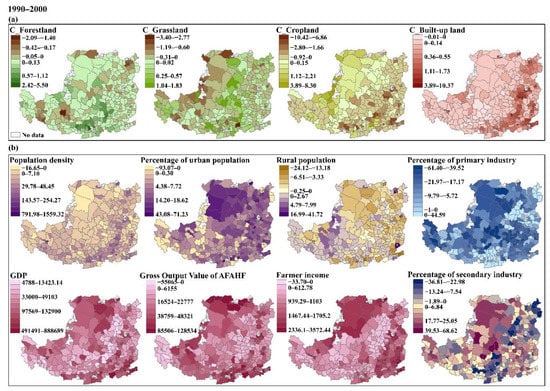 Figure 7b depicts the changes of multiple socioeconomic factors that were included in the four GWR models (Table S6). From 1990 to 2000, population density and percentage of urban population increased in most counties (93% and 88%, respectively), and 56% of counties experienced decreases in rural population, indicating the population urbanization trends, with concentrations in the northern and eastern areas. Industry structure has changed during this period, characterized by noticeable decreasing primary industry percent in the north, center and southeast, concurrently with increasing secondary industry percent. GDP (Gross Domestic Product) and Gross Output Value of AFAHF (i.e., agriculture, forestry, animal husbandry and fishery) increased across the region, most notably in the northern and southern extremities. A pronounced increasing trend of farmer income was found in the northern and eastern parts of the region.